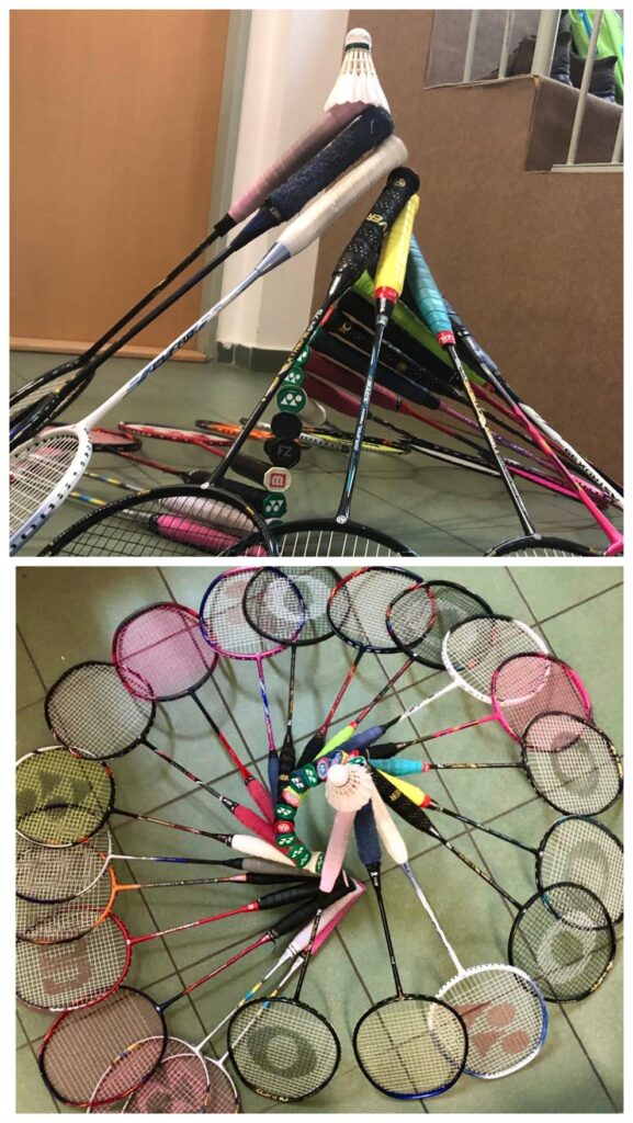 Protože do singlu pak bylo celkem daleko, Týnka si mezitím začala skládat z raket, které si napůjčovala od vedle bivakujících hráčů, stromeček, jehož špičku hodlala ozdobit badmintonovým míčkem. Ale stromeček se jí nakonec moc nelíbil, tak místo něj nakonec udělala kolečko – bylo působivější pravidelností i výškou. A míček se na něj nakonec taky hezky šikoval!